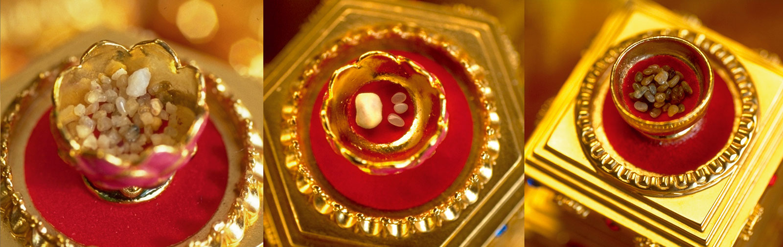 In Tibet relics include small pearl-like objects that are the manifestations of Spiritual Teachers. Known as ringsel they vary in colour. And most importantly they are apparently “alive”. They interact with the environment directly bringing peace to where ever they are. For example crime rates drops in the local area for the time they are displayed. Being in their presence is a blessing.